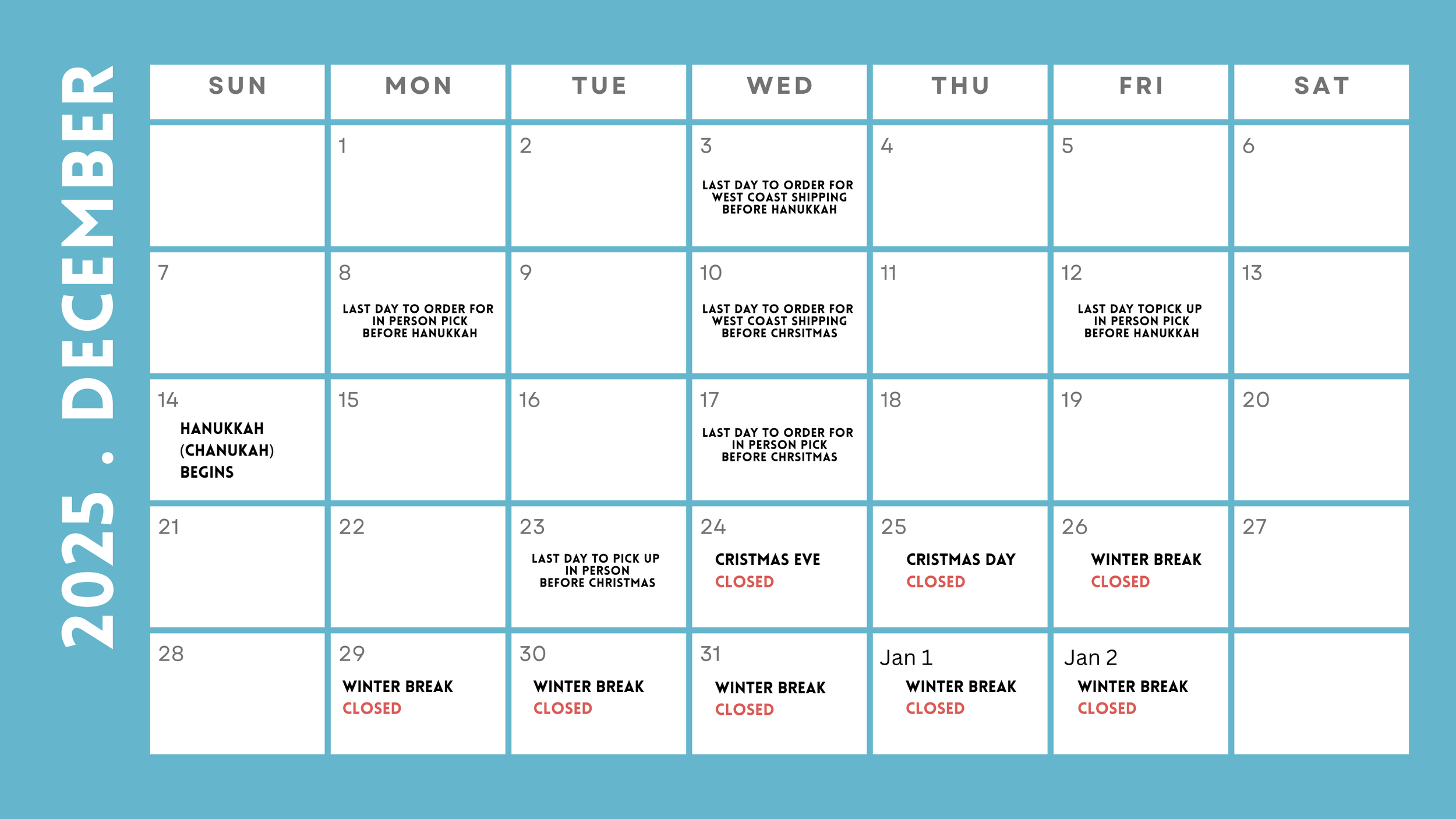 If you are within these cutoff dates call us and discuss getting an order before Hanukkah or Christmas, we might still be able to help you get that done.